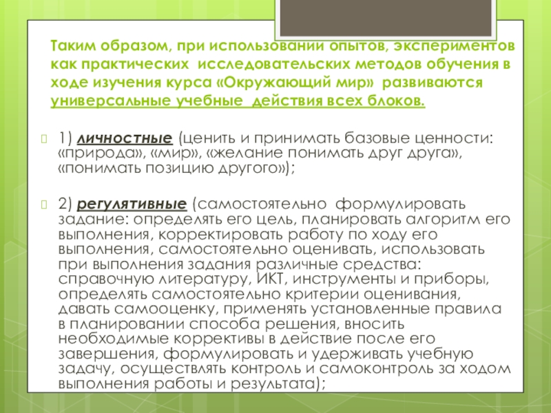 2) регулятивные (самостоятельно формулировать задание: определять его цель, планировать алгоритм его выполнения, корректировать работу по ходу его выполнения, самостоятельно оценивать, использовать при выполнения задания различные средства: справочную литературу, ИКТ, инструменты и приборы, определять самостоятельно критерии оценивания, давать самооценку, применять установленные правила в планировании способа решения, вносить необходимые коррективы в действие после его завершения, формулировать и удерживать учебную задачу, осуществлять контроль и самоконтроль за ходом выполнения работы и результата);