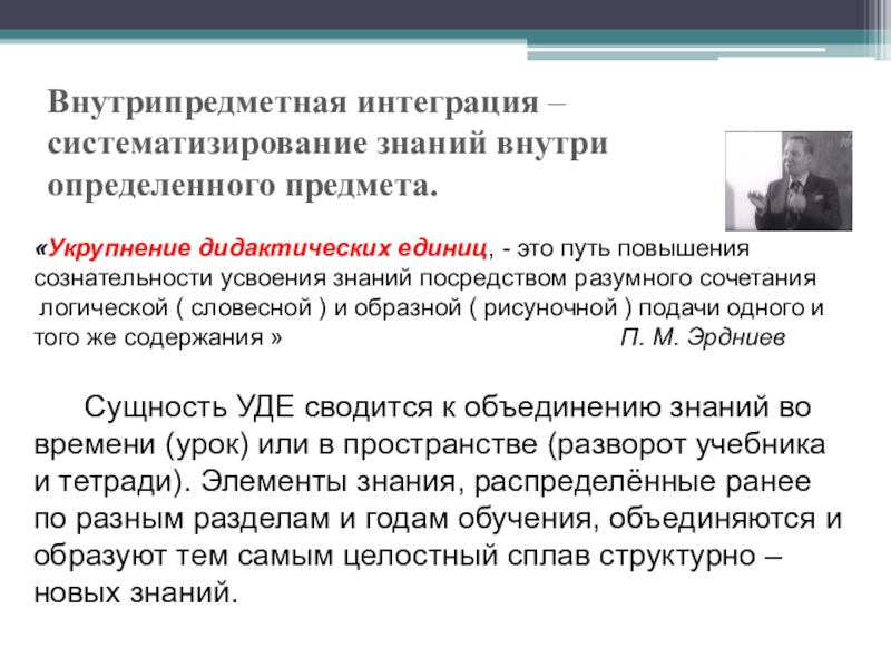 Сущность УДЕ сводится к объединению знаний во времени (урок) или в пространстве (разворот учебника и тетради). Элементы знания, распределённые ранее по разным разделам и годам обучения, объединяются и образуют тем самым целостный сплав структурно – новых знаний.