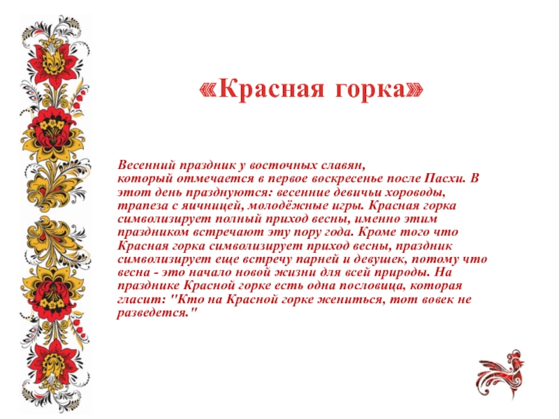 Пасхи. В этот день празднуются: весенние девичьи хороводы, трапеза с яичницей, молодёжные игры. Красная горка символизирует полный приход весны, именно этим праздником встречают эту пору года. Кроме того что Красная горка символизирует приход весны, праздник символизирует еще встречу парней и девушек, потому что весна - это начало новой жизни для всей природы. На празднике Красной горке есть одна пословица, которая гласит: "Кто на Красной горке жениться, тот вовек не разведется."