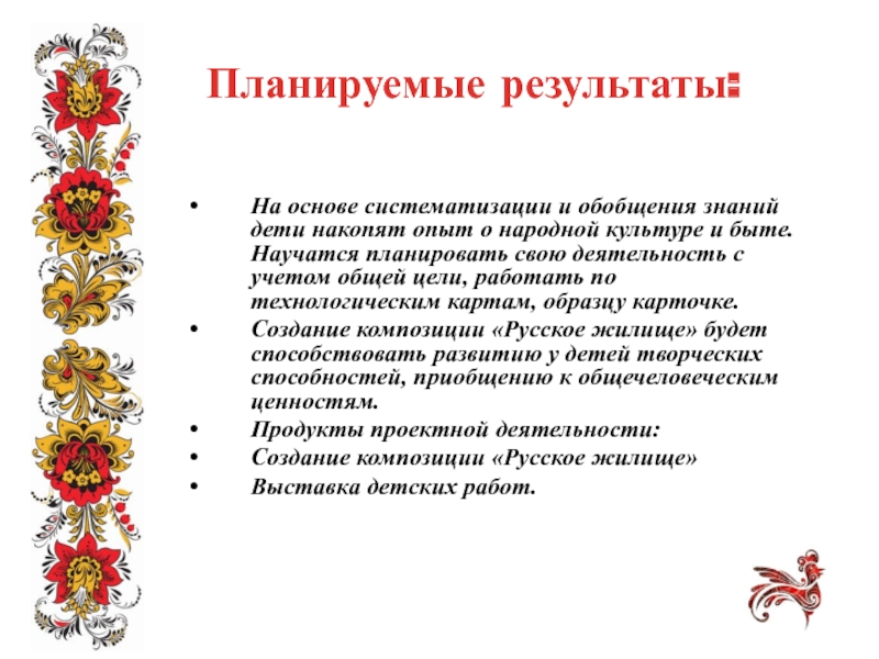 народной культуре и быте. Научатся планировать свою деятельность с учетом общей цели, работать по технологическим картам, образцу карточке.