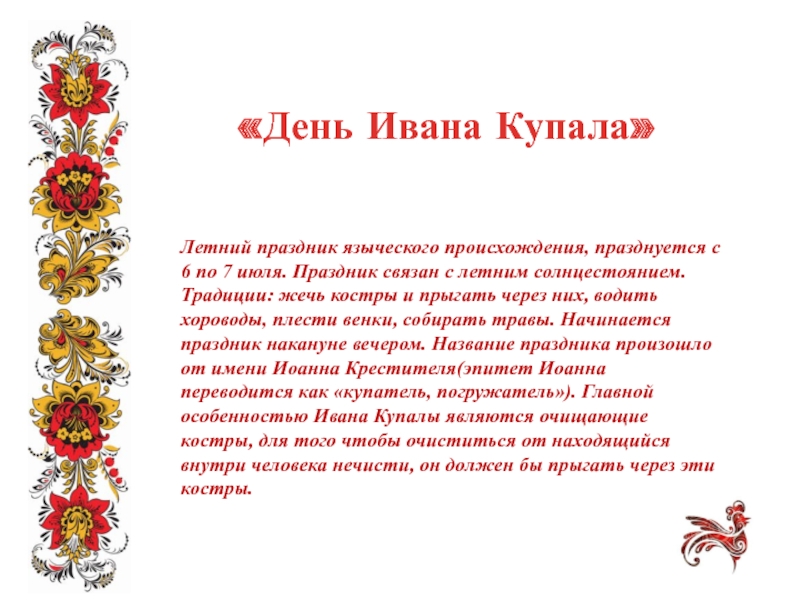 Праздник связан с летним солнцестоянием. Традиции: жечь костры и прыгать через них, водить хороводы, плести венки, собирать травы. Начинается праздник накануне вечером. Название праздника произошло от имени Иоанна Крестителя(эпитет Иоанна переводится как «купатель, погружатель»). Главной особенностью Ивана Купалы являются очищающие костры, для того чтобы очиститься от находящийся внутри человека нечисти, он должен бы прыгать через эти костры.