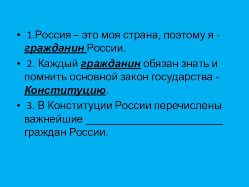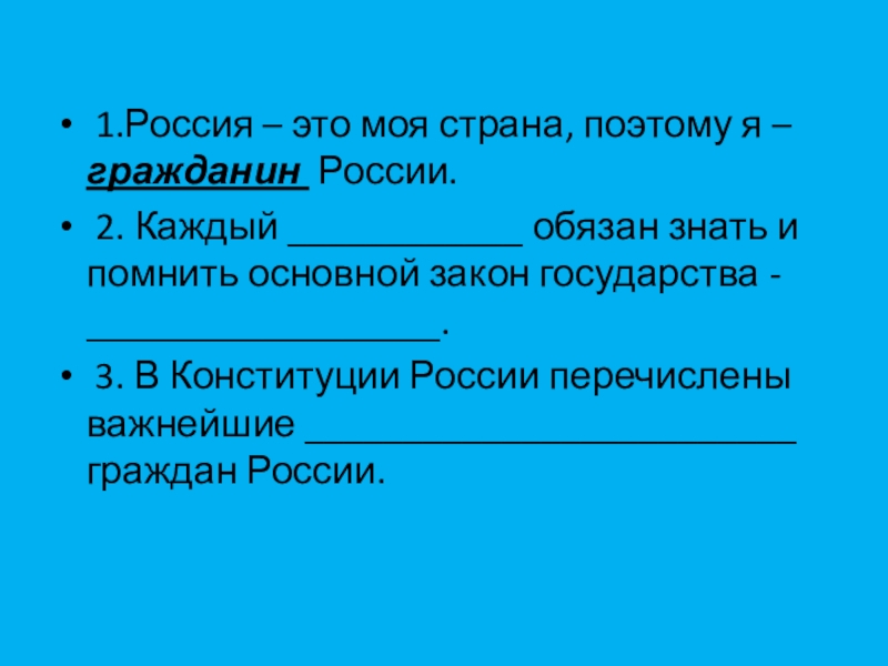 1.Россия – это моя страна, поэтому я – гражданин России. 2. Каждый ____________ обязан знать и