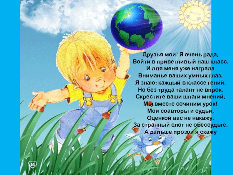 Друзья мои! Я очень рада, Войти в приветливый наш класс. И для меня уже награда Вниманье ваших умных глаз. Я знаю: каждый в классе гений. Но без труда талант не впрок. Скрестите ваши шпаги мнений, Мы