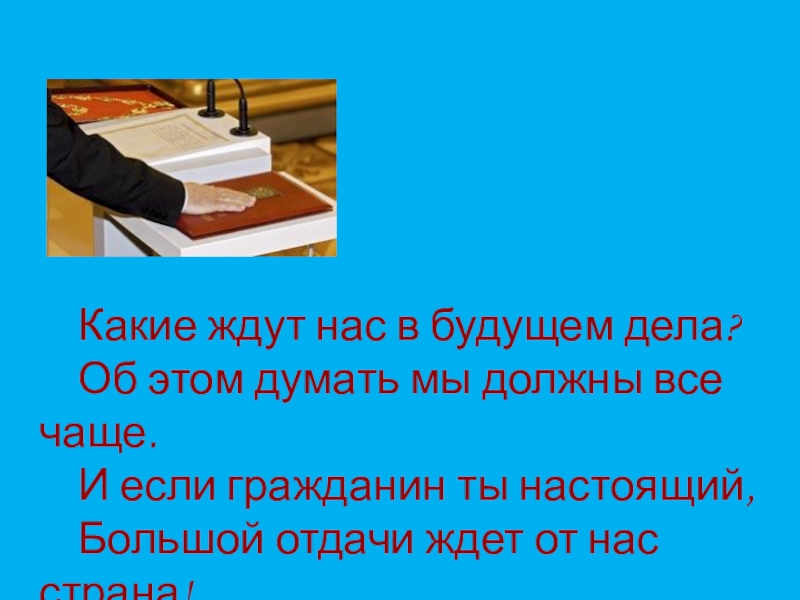 Какие ждут нас в будущем дела?Об этом думать мы должны все чаще.И если гражданин ты настоящий,Большой отдачи