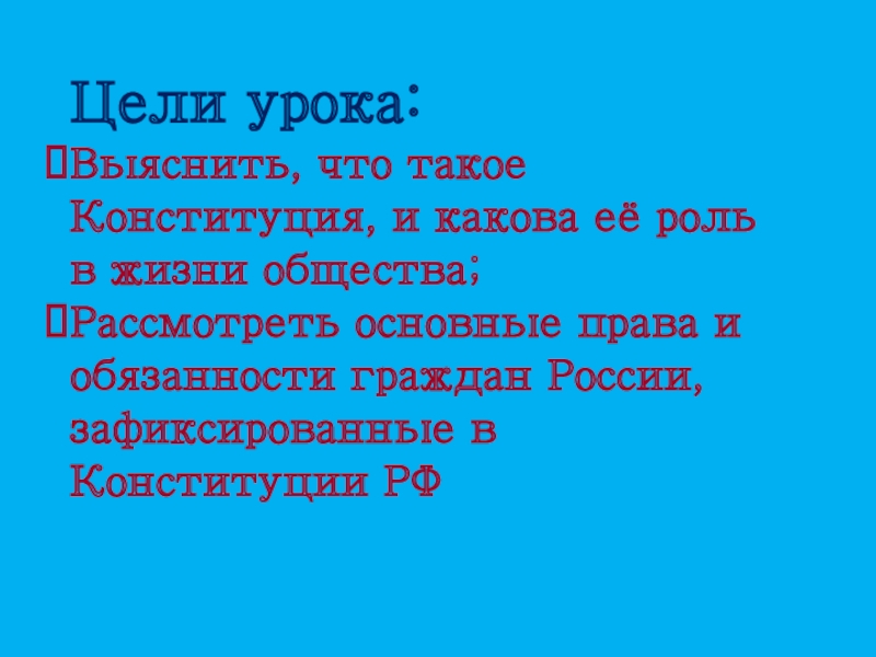 Цели урока:Выяснить, что такое Конституция, и какова её роль в жизни общества;Рассмотреть основные права и обязанности граждан