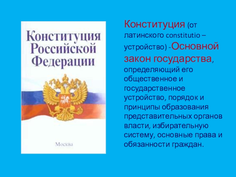 Слайд 19Конституция (от латинского constitutio – устройство) -Основной закон государства, определяющий его