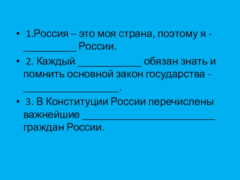 1.Россия – это моя страна, поэтому я - __________ России. 2. Каждый ____________ обязан знать и