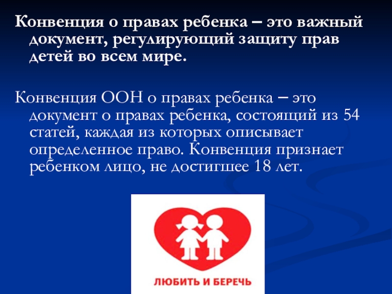 Конвенция ООН о правах ребенка – это документ о правах ребенка, состоящий из 54 статей, каждая из которых описывает определенное право. Конвенция признает ребенком лицо, не достигшее 18 лет.