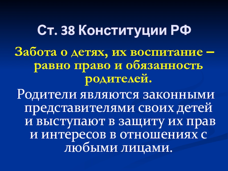 Родители являются законными представителями своих детей и выступают в защиту их прав и интересов в отношениях с любыми лицами.