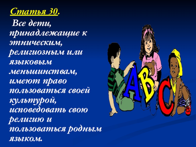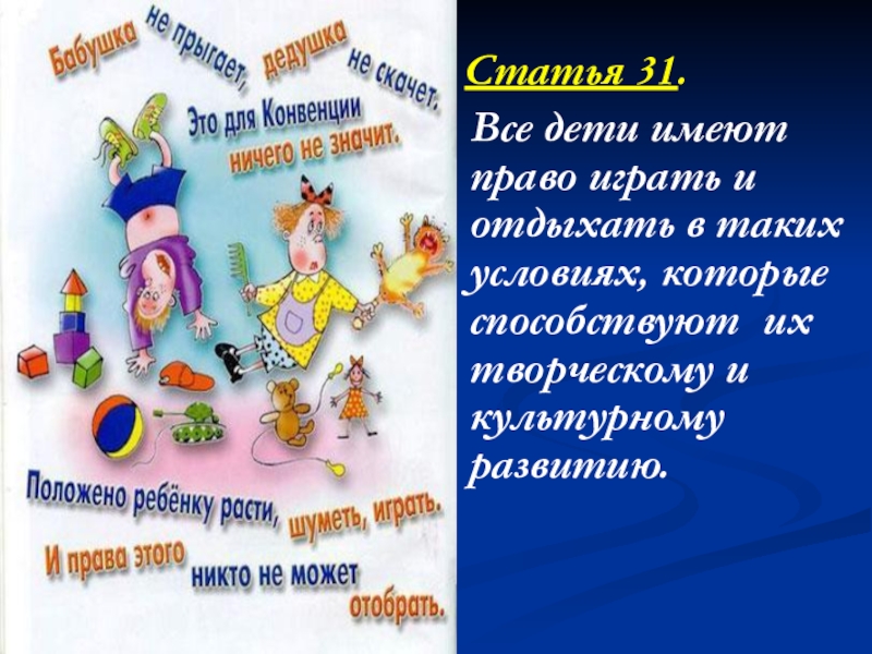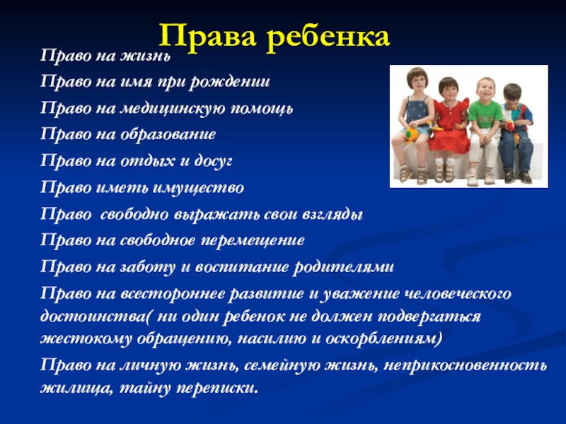 Право на всестороннее развитие и уважение человеческого достоинства( ни один ребенок не должен подвергаться жестокому обращению, насилию и оскорблениям)