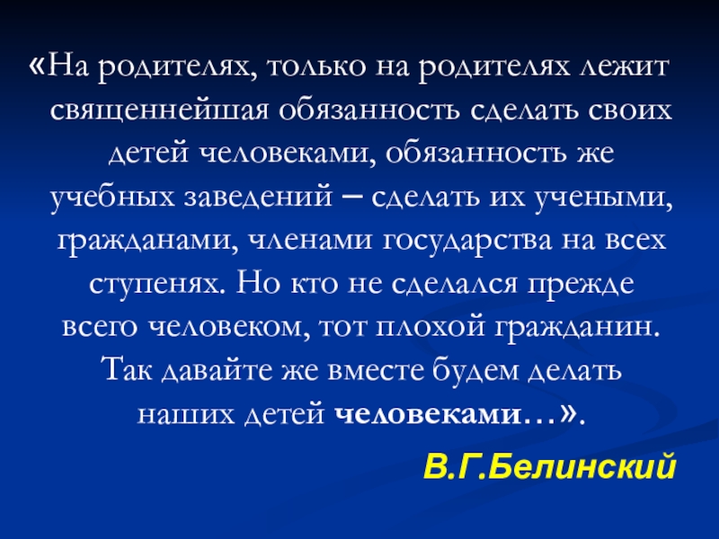 «На родителях, только на родителях лежит священнейшая обязанность сделать своих детей человеками, обязанность же учебных заведений – сделать их учеными, гражданами, членами государства на всех ступенях. Но кто не сделался прежде всего человеком, тот плохой гражданин. Так давайте же вместе будем делать наших детей человеками…».