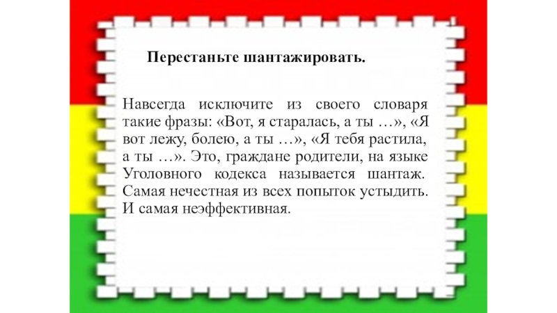 «Вот, я старалась, а ты …», «Я вот лежу, болею, а ты …», «Я тебя растила, а ты …». Это, граждане родители, на языке Уголовного кодекса называется шантаж. Самая нечестная из всех попыток устыдить. И самая неэффективная.