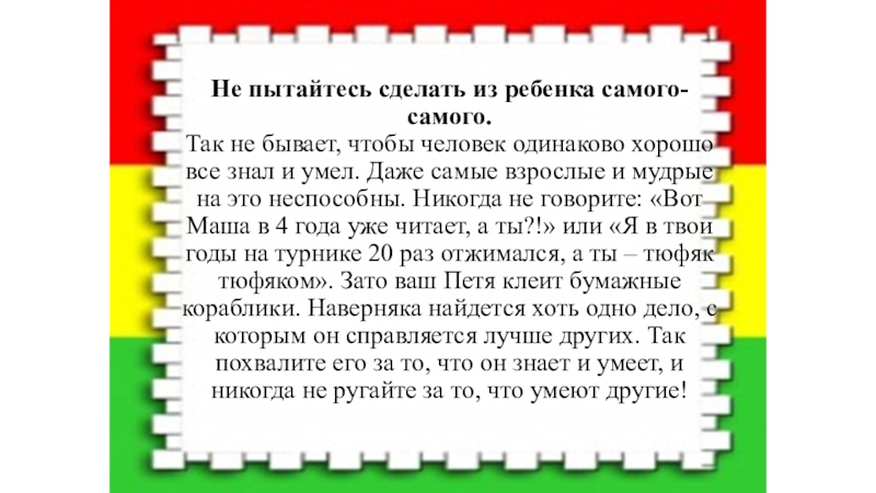 хорошо все знал и умел. Даже самые взрослые и мудрые на это неспособны. Никогда не говорите: «Вот Маша в 4 года уже читает, а ты?!» или «Я в твои годы на турнике 20 раз отжимался, а ты – тюфяк тюфяком». Зато ваш Петя клеит бумажные кораблики. Наверняка найдется хоть одно дело, с которым он справляется лучше других. Так похвалите его за то, что он знает и умеет, и никогда не ругайте за то, что умеют другие!