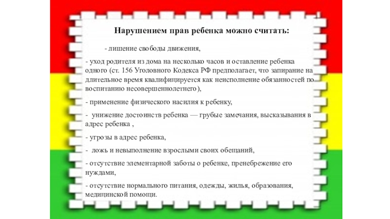 - уход родителя из дома на несколько часов и оставление ребенка одного (ст. 156 Уголовного Кодекса РФ предполагает, что запирание на длительное время квалифицируется как неисполнение обязанностей по воспитанию несовершеннолетнего),