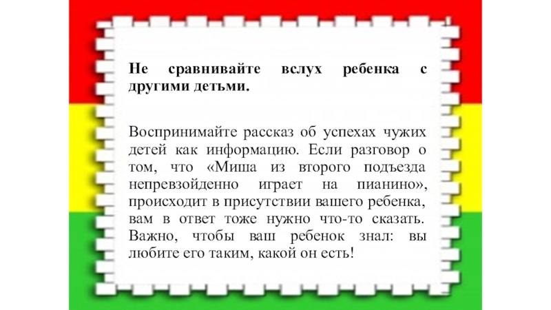 Воспринимайте рассказ об успехах чужих детей как информацию. Если разговор о том, что «Миша из второго подъезда непревзойденно играет на пианино», происходит в присутствии вашего ребенка, вам в ответ тоже нужно что-то сказать. Важно, чтобы ваш ребенок знал: вы любите его таким, какой он есть!