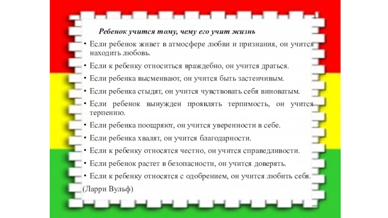 ребенок живет в атмосфере любви и признания, он учится находить любовь.