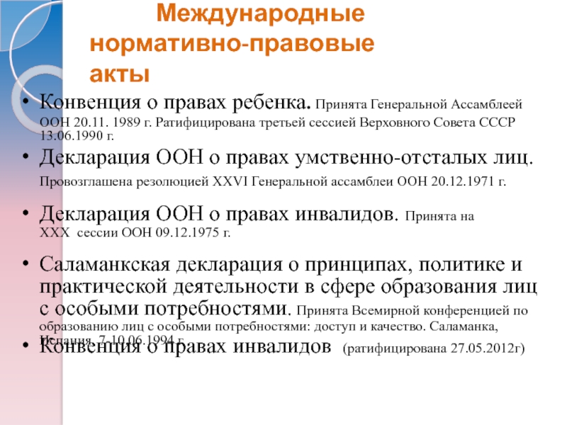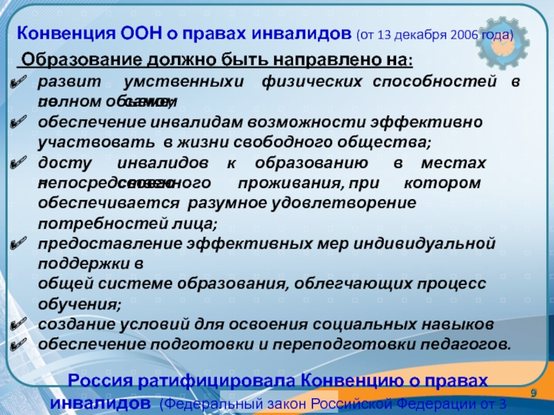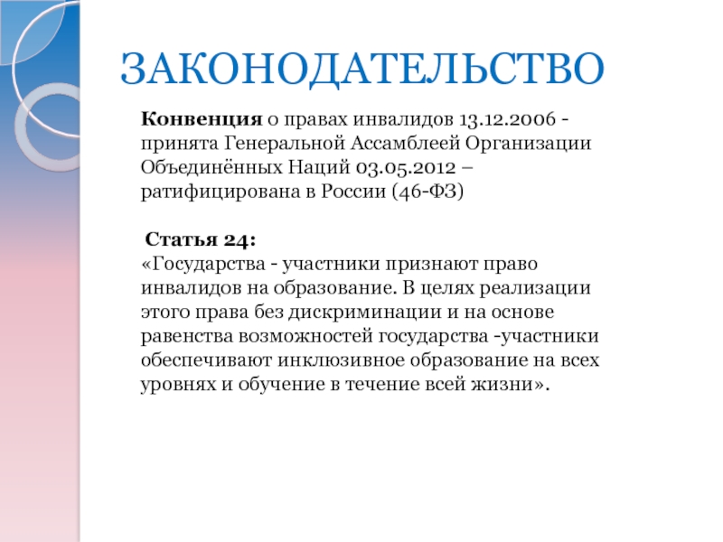 Россия ратифицировала Конвенцию о правах инвалидов (Федеральный закон Российской Федерации от 3 мая 2012 г. №46-ФЗ "О ратификации Конвенции о правах инвалидов")