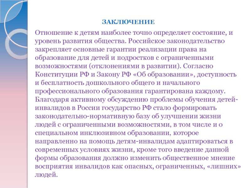 Образование лиц с ограниченными возможностями здоровья и инвалидов является одним из приоритетных направлений деятельности системы образования Российской Федерации