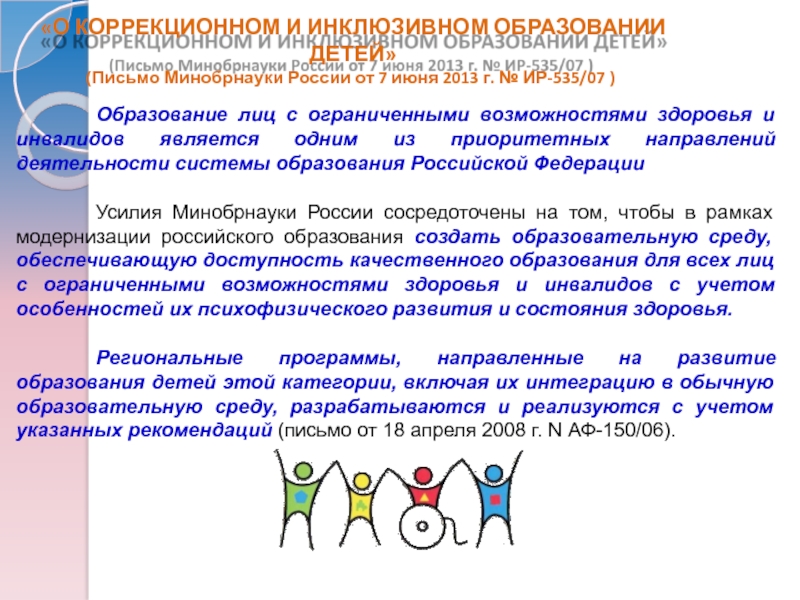 Региональные программы, направленные на развитие образования детей этой категории, включая их интеграцию в обычную образовательную среду, разрабатываются и реализуются с учетом указанных рекомендаций (письмо от 18 апреля 2008 г. N АФ-150/06).