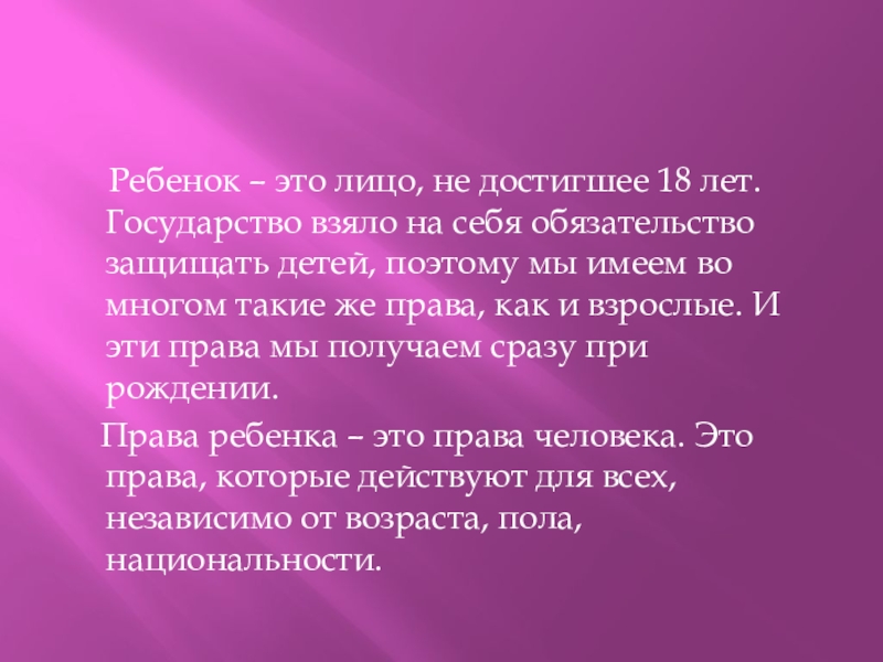 Государство взяло на себя обязательство защищать детей, поэтому мы имеем во многом такие же права, как и взрослые. И эти права мы получаем сразу при рождении.