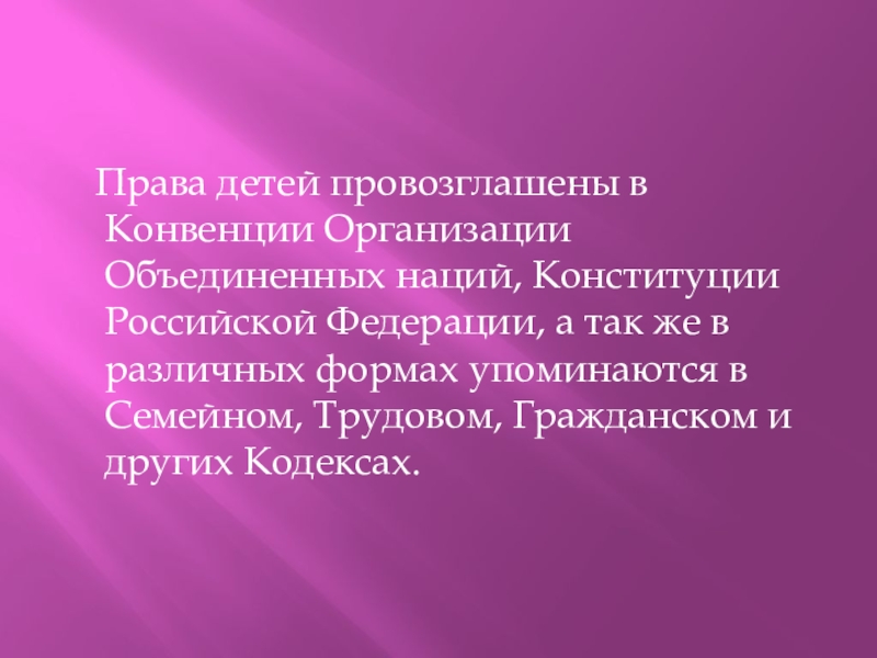 Слайд 3 Права детей провозглашены в Конвенции Организации Объединенных наций, Конституции