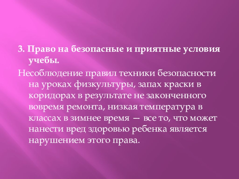 на уроках физкультуры, запах краски в коридорах в результате не законченного вовремя ремонта, низкая температура в классах в зимнее время — все то, что может нанести вред здоровью ребенка является нарушением этого права.