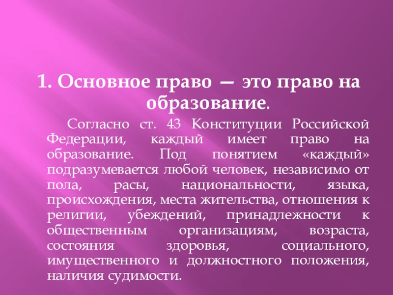 ст. 43 Конституции Российской Федерации, каждый имеет право на образование. Под понятием «каждый» подразумевается любой человек, независимо от пола, расы, национальности, языка, происхождения, места жительства, отношения к религии, убеждений, принадлежности к общественным организациям, возраста, состояния здоровья, социального, имущественного и должностного положения, наличия судимости.