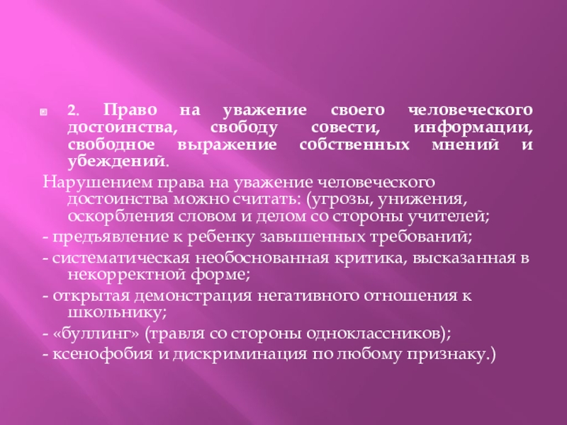 Нарушением права на уважение человеческого достоинства можно считать: (угрозы, унижения, оскорбления словом и делом со стороны учителей;