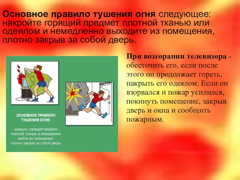 При возгорании телевизора - обесточить его, если после этого он продолжает гореть, накрыть его одеялом. Если он взорвался и пожар усилился, покинуть помещение, закрыв дверь и окна и сообщить пожарным.