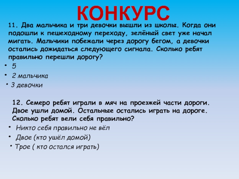 12. Семеро ребят играли в мяч на проезжей части дороги. Двое ушли домой. Остальные остались играть на дороге. Сколько ребят вели себя правильно?