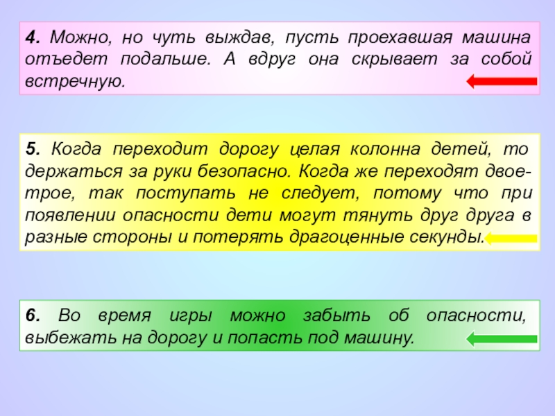 5. Когда переходит дорогу целая колонна детей, то держаться за руки безопасно. Когда же переходят двое-трое, так поступать не следует, потому что при появлении опасности дети могут тянуть друг друга в разные стороны и потерять драгоценные секунды.