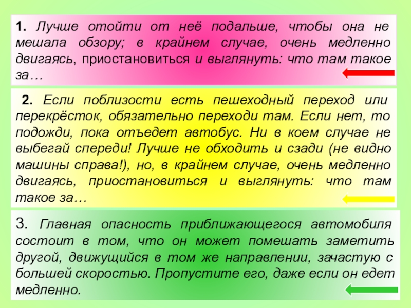 2. Если поблизости есть пешеходный переход или перекрёсток, обязательно переходи там. Если нет, то подожди, пока отъедет автобус. Ни в коем случае не выбегай спереди! Лучше не обходить и сзади (не видно машины справа!), но, в крайнем случае, очень медленно двигаясь, приостановиться и выглянуть: что там такое за…