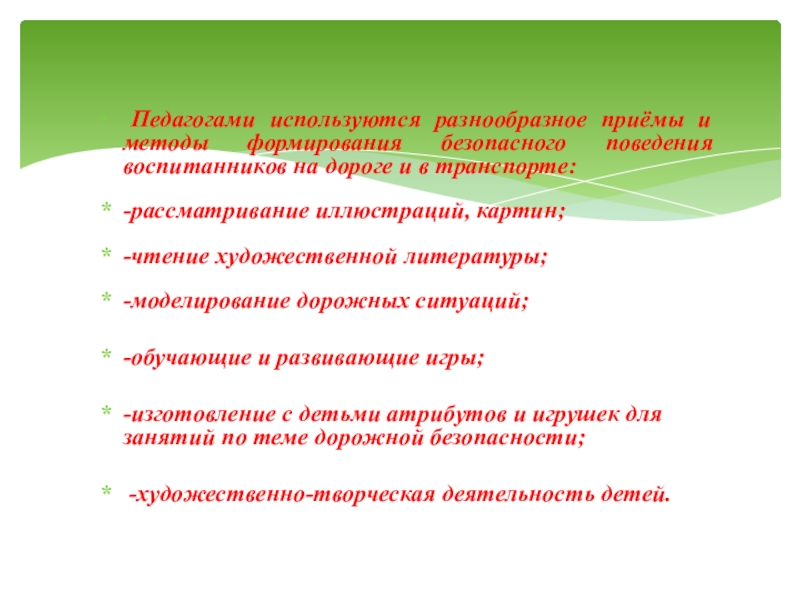 Слайд 4 Педагогами используются разнообразное приёмы и методы формирования безопасного поведения воспитанников