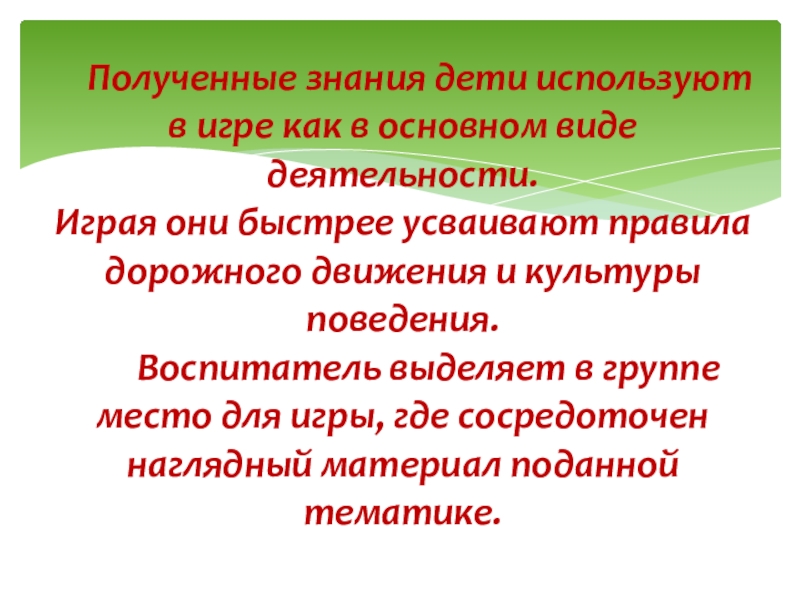 основном виде деятельности. Играя они быстрее усваивают правила дорожного движения и культуры поведения.