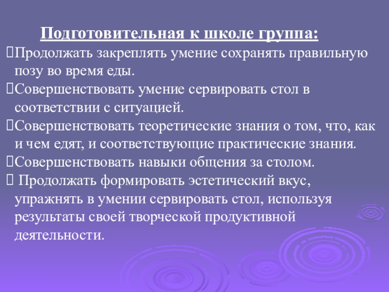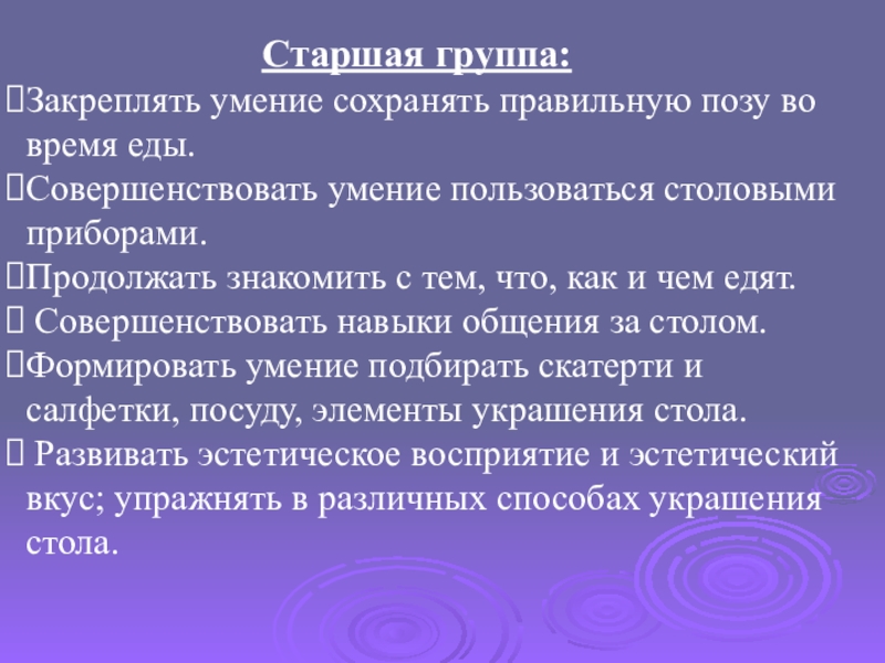 Продолжать формировать эстетический вкус, упражнять в умении сервировать стол, используя результаты своей творческой продуктивной деятельности.