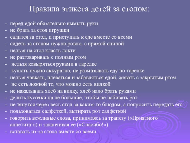 говорить вежливые слова, принимаясь за трапезу («Приятного аппетита!») и заканчивая ее («Спасибо!»)