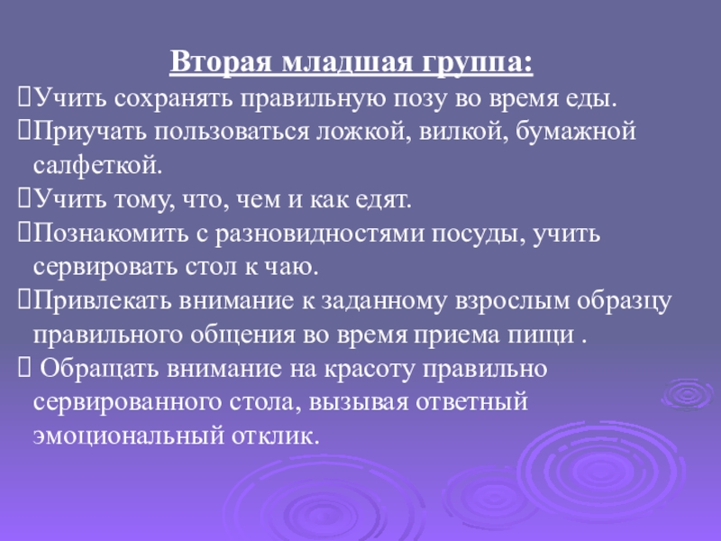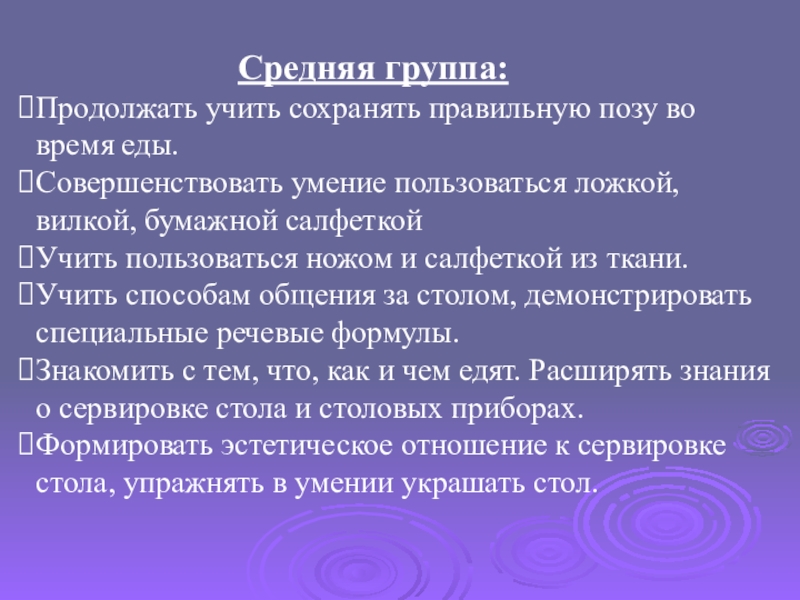 Учить способам общения за столом, демонстрировать специальные речевые формулы.