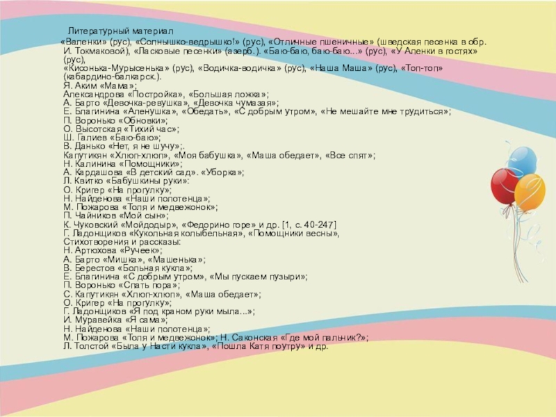И. Токмаковой), «Ласковые песенки» (азерб.). «Баю-баю, баю-баю...» (рус), «У Аленки в гостях»