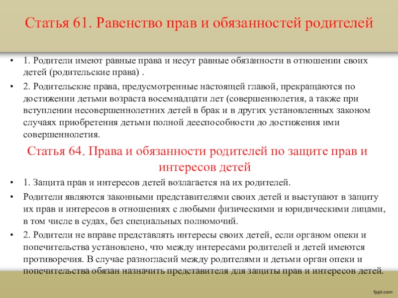 Слайд 8Статья 61. Равенство прав и обязанностей родителей