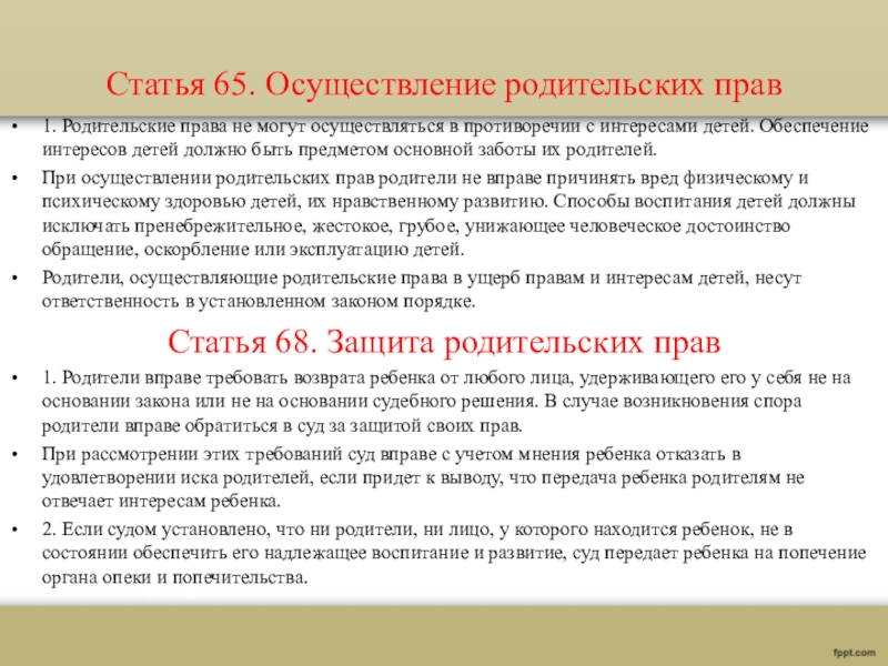 Слайд 9Статья 65. Осуществление родительских прав