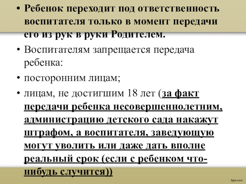 Слайд 2Ребенок переходит под ответственность воспитателя только в момент передачи его из
