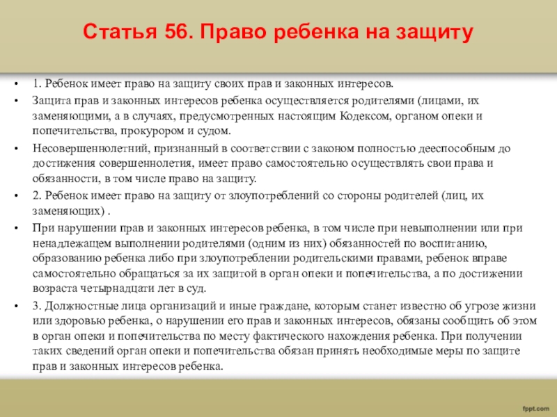 Слайд 7Статья 56. Право ребенка на защиту