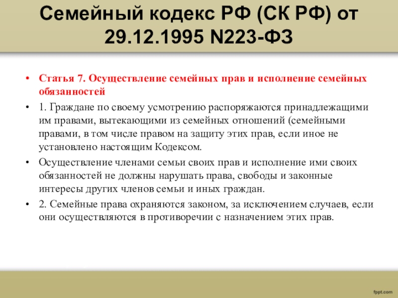 Слайд 5Семейный кодекс РФ (СК РФ) от 29.12.1995 N223-ФЗ