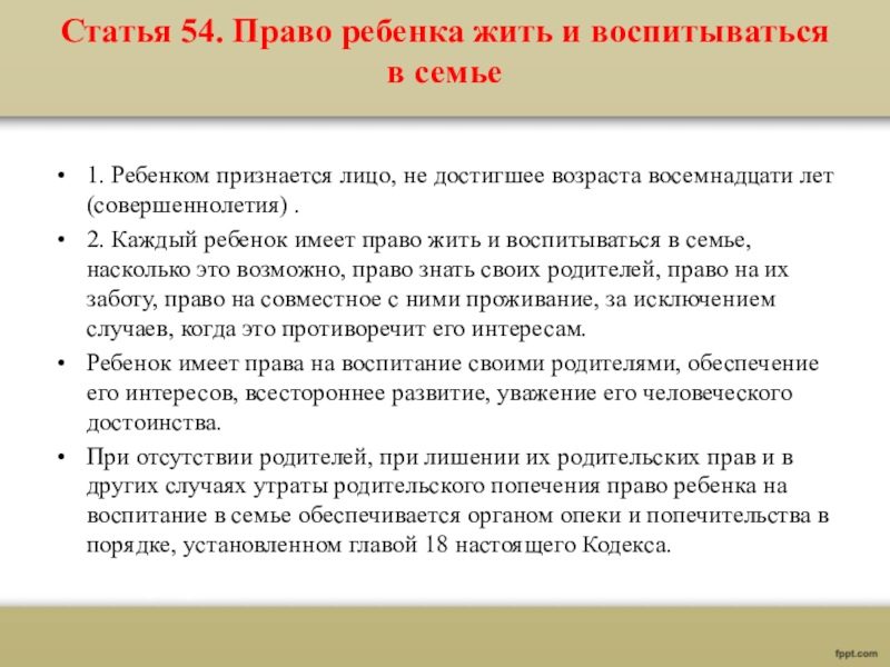 Слайд 6Статья 54. Право ребенка жить и воспитываться в семье