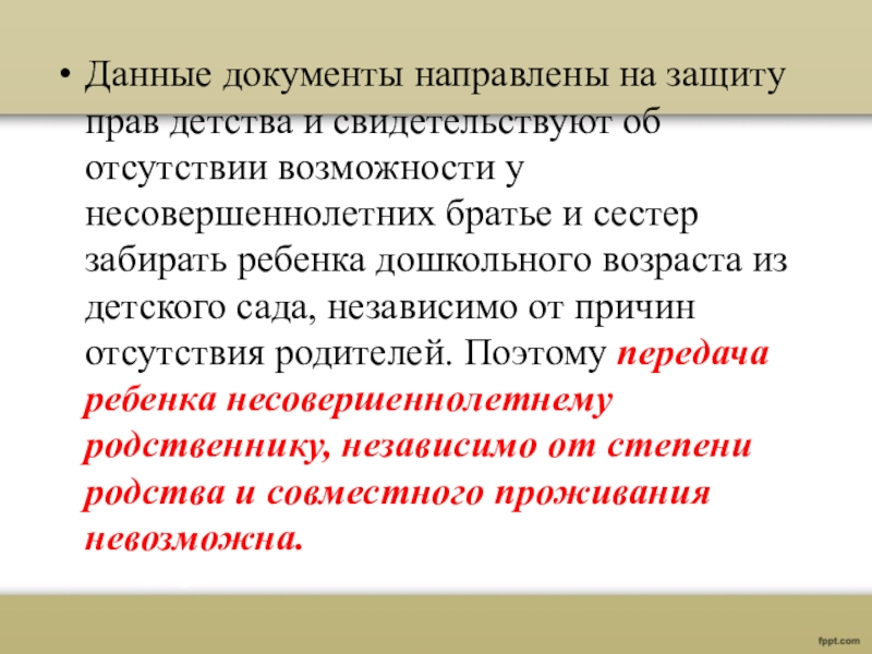 возможности у несовершеннолетних братье и сестер забирать ребенка дошкольного возраста из детского сада, независимо от причин отсутствия родителей. Поэтому передача ребенка несовершеннолетнему родственнику, независимо от степени родства и совместного проживания невозможна.