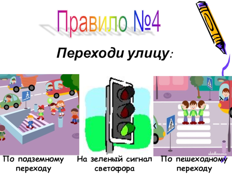 Правило №4Переходи улицу:По подземному переходуНа зеленый сигнал светофораПо пешеходному переходу
