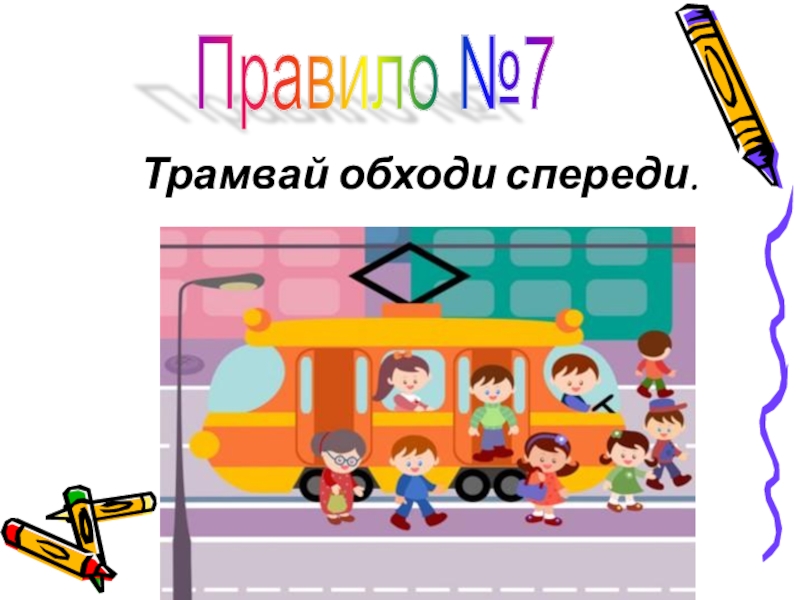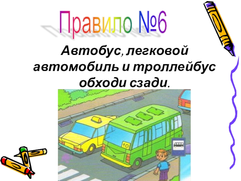Правило №6Автобус, легковой автомобиль и троллейбус обходи сзади.