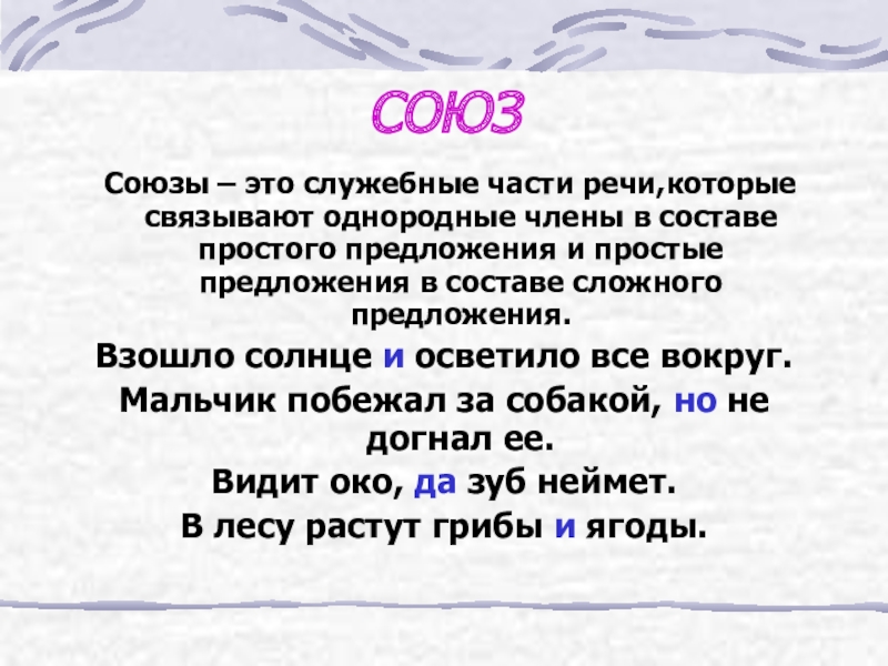 Союзы – это служебные части речи,которые связывают однородные члены в