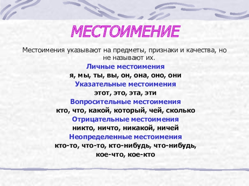 Местоимения указывают на предметы, признаки и качества, но не называют их.