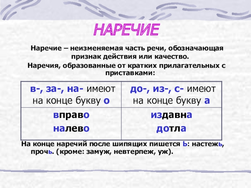 Наречие – неизменяемая часть речи, обозначающая признак действия или качество.